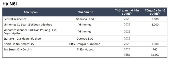 Lượng sản phẩm này đến từ 6 dự án nổi bật gồm Vinhomes Cổ Loa (giai đoạn tiếp theo, 3.000 căn), Vinhomes Wonder Park Dan Phuong (giai đoạn tiếp theo) của chủ đầu tư Vinhomes, Central Residence (2.600 căn) của Gamuda Land, Starlake (giai đoạn tiếp theo) của Daewoo E&C, North Ha Noi Smart City (7.000 căn) của BRG Group & Sumitomo, Eco Smart City Co Linh (760 căn) của Thiên Hương.