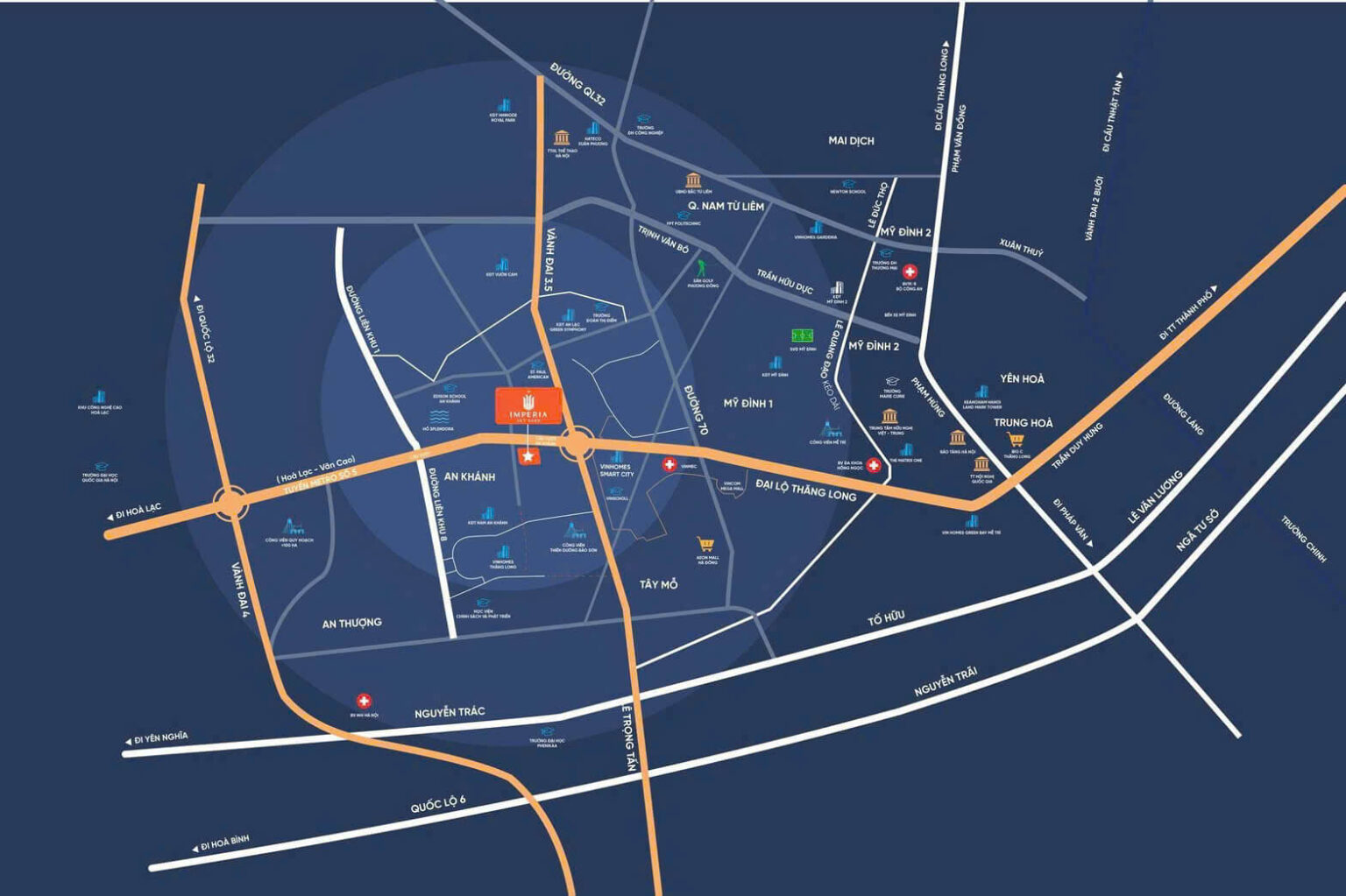 - Ngay sát Đại lộ Thăng Long (rộng 140m, 6 làn xe) – tuyến huyết mạch nối trung tâm Hà Nội với Hòa Lạc, Hòa Bình.