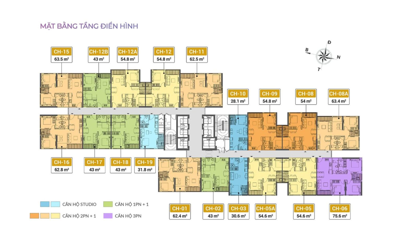 - Loại hình sản phẩm: Căn hộ Studio, 01 PN+, 02 PN, 02 PN+, Sky Villa, Shophouse khối đế