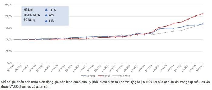 Giá nhà ở tiếp tục tăng cao và thiết lập mặt bằng mới tại hầu hết các khu vực. Tại Hà Nội, giá căn hộ chào bán mới trung bình đạt khoảng 100 triệu/m2, tăng 40% so với năm 2024. Tại TP HCM cũ, giá đạt trung bình 111 triệu/m2, tăng 23%. Tại Đà Nẵng, giá vượt ngưỡng 83 triệu/m2, tăng 14%”, ông Chung nói.