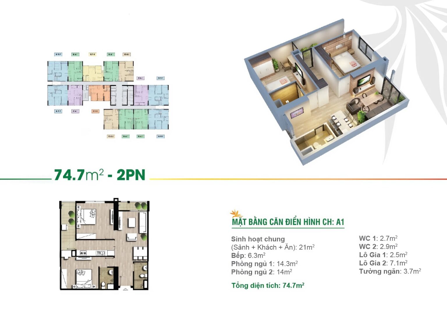 Căn hộ 2 phòng ngủ+74,6 – 74,8 m25,6 – 6.4 tỷ