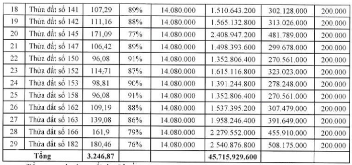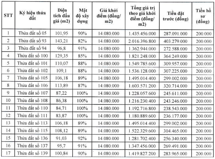 Cụ thể là quyền sử dụng đất đối với 29 thửa đất thuộc dự án xây dựng HTKT tại khu Man Cá, Man Cổng, Mạ Man Trong, thôn Văn Quán, xã Thanh Oai, TP Hà Nội, (trước đây là khu Man Cá, Man Cổng, Mạ Man Trong, thôn Văn Quán, xã Đỗ Động, huyện Thanh Oai). Các thửa đất có diện tích 83 – 180 m²/thửa với mức giá khởi điểm 14 triệu đồng/m2.